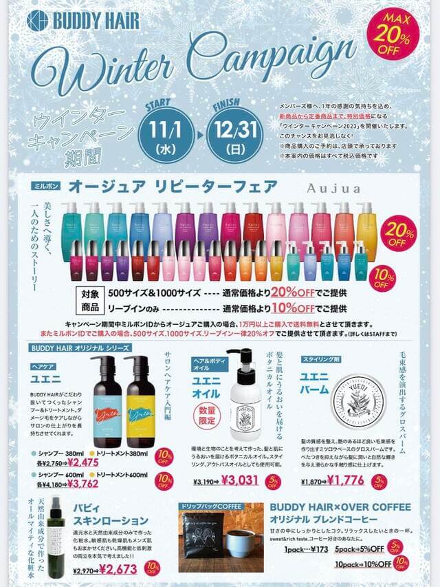 buddy hairでは年に2回夏と冬、お店で取り扱っている商品がお値打ち価格になるキャンペーンをしています!