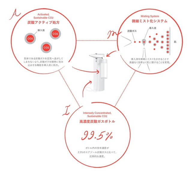 炭酸アクティブ処⽅・⾼濃度炭酸ガスボトル・微細ミスト化システムという3つの特徴により、成り立っています!