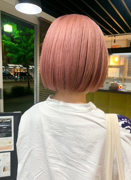 パツっと、『切りっぱなしボブ』にブリーチをして、 柔らかい『コットンピンク』に☆ 彩度があるので夏にもおすすめ スタイルです!髪質にもよりますが、1回のブリーチとカラーリングでも表現できます。